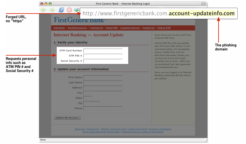 2. Forged URL. Even if a link has a name you recognize somewhere in it, it doesn't mean it links to the real organization. Read URLs from right to left — the real domain is at the end of the URL. Also, websites where it is safe to enter personal information begin with "https" — the "s" stands for secure. If you don't see "https" do not proceed. Look out for URLs that begin with an IP address, such as: http://12.34.56.78/firstgenericbank/account-update/ — these are likely phishes.